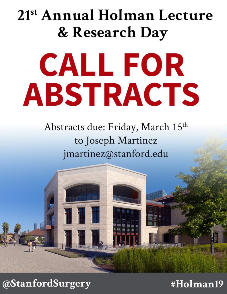The Department of Surgery is now accepting abstracts for the 21st Annual Holman Lecture! Abstracts are due by Friday, March 15 at 11:59 PM PST to Joseph Martinez (jmartinez@stanford.edu).