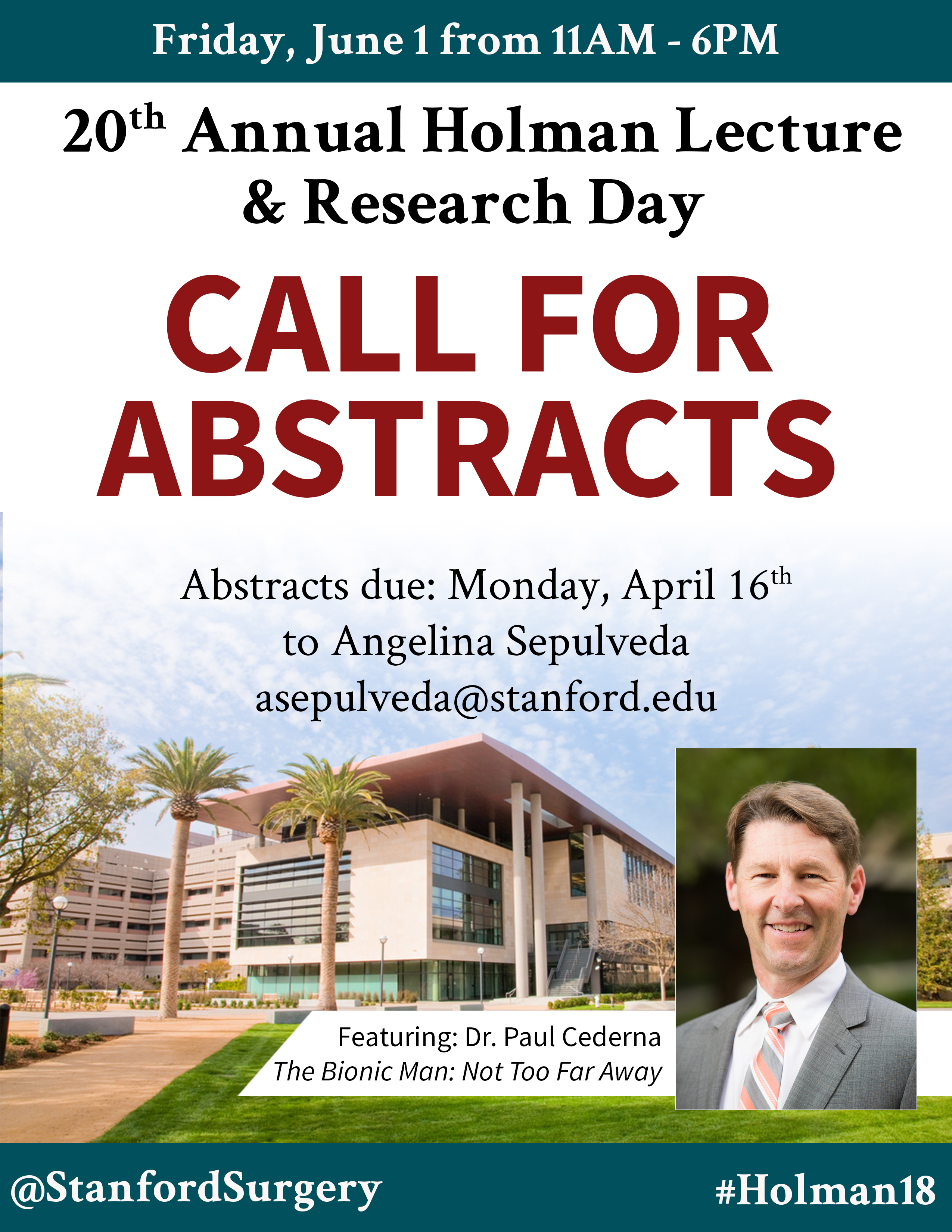 Holman Lecture Abstract Submission Deadline Calendar Add to Calendar Add to Timely Calendar Add to Google Add to Outlook Add to Apple Calendar Add to other calendar Export to XML When: April 16, 2018 all-day 2018-04-16T00:00:00-07:00 2018-04-17T00:00:00-07:00 Abstract Submission Deadlines